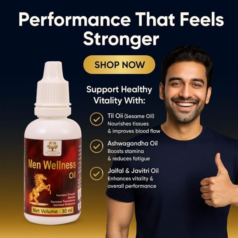 Reignite your energy and confidence with Men Mate — an Ayurvedic performance capsule crafted for modern men. A powerful blend of Ashwagandha, Gokshura, Safed Musli and Kaunch Beej, designed to boost stamina, vitality, and overall performance — naturally!Stay strong. Stay active. Stay unstoppable — with Men Mate. 🌿 100% Ayurvedic/Herbal | No Side Effects | Made in IndiaMEN WELLNESS OIL