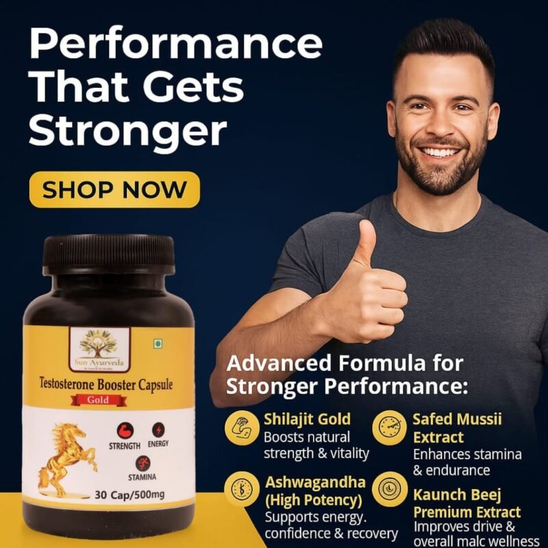 Boost your testosterone levels naturally with Testosterone Booster — a premium Ayurvedic formula by Sun Ayurveda. Powered by Ashwagandha, Gokshura, Safed Musli and Kaunch Beej, it helps improve stamina, strength, muscle growth, energy and male performance. Experience long-lasting vitality and confidence — the natural way.100% Ayurvedic | No Side Effects | Made in IndiaTESTOSTERONE BOOSTER CAPSULE (GOLD)