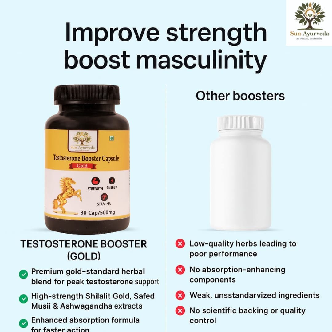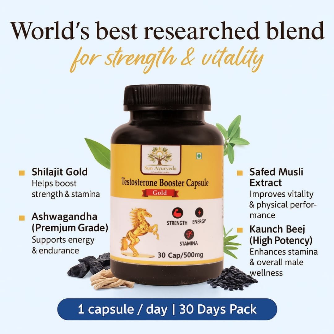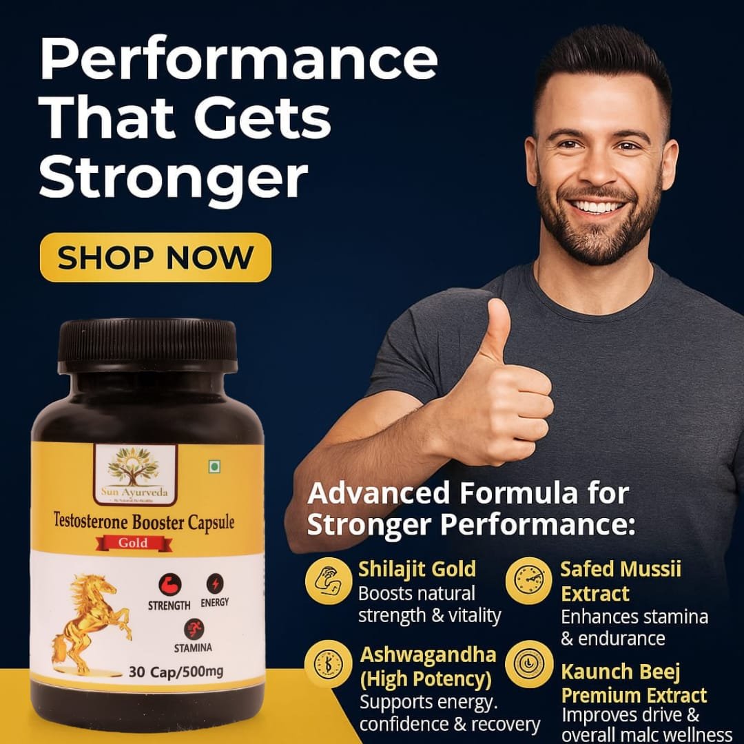 Boost your testosterone levels naturally with Testosterone Booster — a premium Ayurvedic formula by Sun Ayurveda. Powered by Ashwagandha, Gokshura, Safed Musli and Kaunch Beej, it helps improve stamina, strength, muscle growth, energy and male performance. Experience long-lasting vitality and confidence — the natural way.100% Ayurvedic | No Side Effects | Made in India