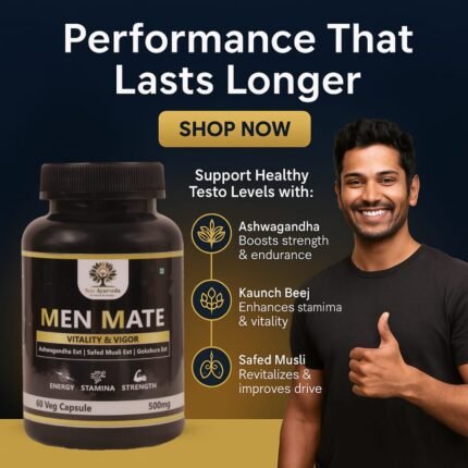 Reignite your energy and confidence with Men Mate — an Ayurvedic performance capsule crafted for modern men. A powerful blend of Ashwagandha, Gokshura, Safed Musli and Kaunch Beej, designed to boost stamina, vitality, and overall performance — naturally!Stay strong. Stay active. Stay unstoppable — with Men Mate. 🌿 100% Ayurvedic/Herbal | No Side Effects | Made in India
